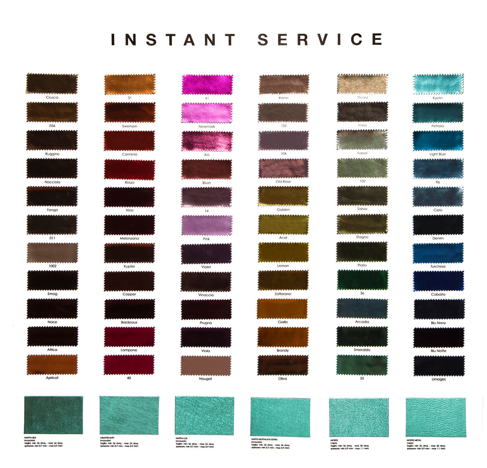 La Conceria Enterprise è in grado di offrire a tutti i suoi clienti un nuovo servizio di Instant Service. Tale servizio prevede la possibilità di ordinare da una selezionata gamma di articoli con la possibilità di scegliere tra le 120 varianti colore proposte.